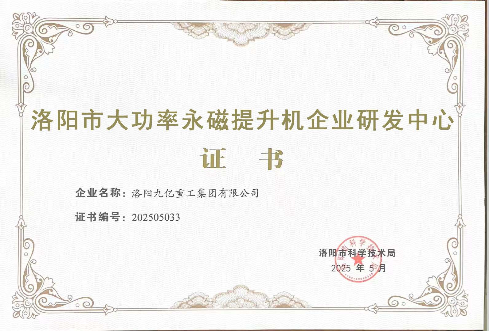 洛陽市大功率永磁提升機企業(yè)研發(fā)中心證書
